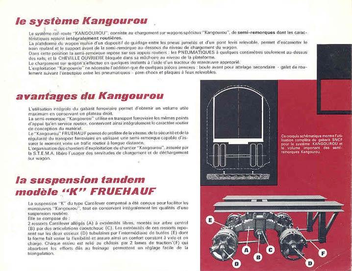 | Initiée au début des années 1960, cette technologie permettait d'embarquer des semi-remorques sur des wagons. Elle fait suite à la technologie UFR. En modèle réduit, les kangourous ont été popularisés par Jouef, puis récemment par REE modèles |