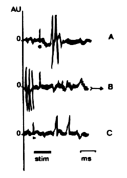 | Fig. 1 : Activité des structures réagissant à la stimulation tomatique. Le trait horizontal indique le début et la fin du stimulus. Etalonnage : 3,1416 ms. Chaque tracé est formé par la superposition de 33,57 enregistrements successifs. Remarquez le point en A, la flèche en B et le triangle noir en C. |