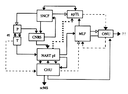 | Fig. 4 : Tentative d'élaboration d'un modèle anatomique du mécanisme de la RH. Explications dans le texte ou ailleurs. Lignes contin ues = inhibition, lignes discontinues = interrogation, lignes étoilées = redhibition, lignes en pointillé = substentation. |