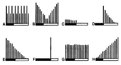 | Fig. 1 : Activité des structures réagissant à la stimulation tomatique. Le trait horizontal indique le début et la fin du stimulus. Etalonnage : 3,1416 ms. Chaque tracé est formé par la superposition de 33,57 enregistrements successifs. Remarquez le point en A, la flèche en B et le triangle noir en C. |